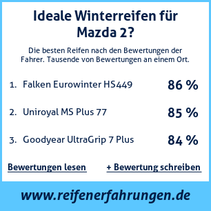 Tests, Bewertungen und Meinungen zu Winter Reifen für Mazda 2. Die von unseren Nutzern am häufigsten verwendeten Reifengrößen für dieses Fahrzeug sind 185 55 R15, 225 45 R17, 195 45 R16, 195 55 R16, 185 60 R16. Mit dieser Übersicht an Bewertungen zu Winter Reifen für Mazda 2 von anderen Autofahrern, versuchen wir Ihnen möglichst objektive Informationen zur Verfügung zu stellen, damit Sie Winter Reifen wählen können. Je mehr Bewertungen, desto genauer und glaubwürdiger ist die Meinung. Wir legen großen Wert darauf, die Bewertungen so objektiv wie möglich zu gestalten.