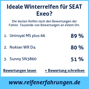 Tests, Bewertungen und Meinungen zu Winter Reifen für SEAT Exeo. Die von unseren Nutzern am häufigsten verwendeten Reifengrößen für dieses Fahrzeug sind 225 45 R17, 225 40 R18, 205 55 R16, 225 45 R18. Mit dieser Übersicht an Bewertungen zu Winter Reifen für SEAT Exeo von anderen Autofahrern, versuchen wir Ihnen möglichst objektive Informationen zur Verfügung zu stellen, damit Sie Winter Reifen wählen können. Je mehr Bewertungen, desto genauer und glaubwürdiger ist die Meinung. Wir legen großen Wert darauf, die Bewertungen so objektiv wie möglich zu gestalten.