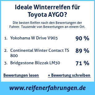 Tests, Bewertungen und Meinungen zu Winter Reifen für Toyota AYGO. Die von unseren Nutzern am häufigsten verwendeten Reifengrößen für dieses Fahrzeug sind 155 65 R14, 225 45 R17, 165 60 R15, 195 45 R15, 165 55 R14. Mit dieser Übersicht an Bewertungen zu Winter Reifen für Toyota AYGO von anderen Autofahrern, versuchen wir Ihnen möglichst objektive Informationen zur Verfügung zu stellen, damit Sie Winter Reifen wählen können. Je mehr Bewertungen, desto genauer und glaubwürdiger ist die Meinung. Wir legen großen Wert darauf, die Bewertungen so objektiv wie möglich zu gestalten.