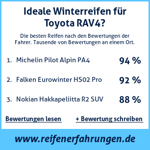 Tests, Bewertungen und Meinungen zu Winter Reifen für Toyota RAV4. Die von unseren Nutzern am häufigsten verwendeten Reifengrößen für dieses Fahrzeug sind 225 65 R17, 225 45 R17, 235 55 R18, 215 70 R16, 235 55 R19. Mit dieser Übersicht an Bewertungen zu Winter Reifen für Toyota RAV4 von anderen Autofahrern, versuchen wir Ihnen möglichst objektive Informationen zur Verfügung zu stellen, damit Sie Winter Reifen wählen können. Je mehr Bewertungen, desto genauer und glaubwürdiger ist die Meinung. Wir legen großen Wert darauf, die Bewertungen so objektiv wie möglich zu gestalten.